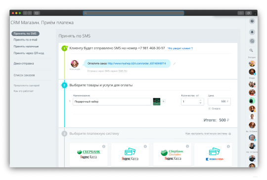 Затем просто отправьте ссылку на оплату по СМС, емейл или в чате.
